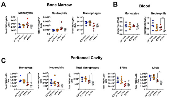Using mice with and without a history of TCDD exposure, we first assessed the presence of sentinel innate immune cells within the bone marrow, blood, and peritoneal cavity in the absence of infection. As shown in Figure 1A and Figure S1, we did not observe significant differences in the numbers of monocytes, macrophages, and neutrophils in the bone marrow of F1 mice compared to CT mice. Using a complete blood count (CBC) analysis, we observed a significant decrease in circulating neutrophils in the blood of male, but not female, F1 mice (Figure 1B). Analysis of peritoneal cell populations revealed a reduction of monocytes and macrophages in F1 male mice (Figure 1C and Figure S2). Interestingly, we specifically observed a decrease in large peritoneal macrophages (LPMs) in F1 males. These data suggest that in utero toxicant exposure induces alterations in innate immune cells that persist into adulthood.