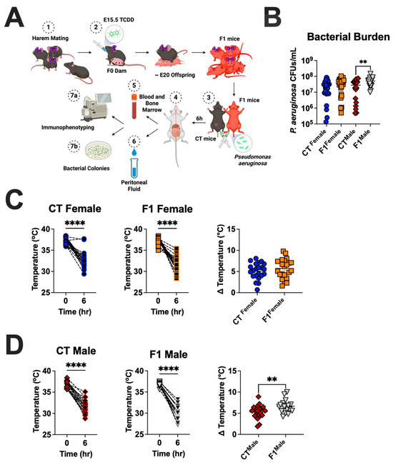 To grasp a more in-depth understanding of the immunological changes that are derived from an in utero toxicant exposure, we used an established Pseudomonas aeruginosa infection model to compare the innate immune response in our toxicant-exposed F1 mice to our naïve wild-type CT mice. Using both male and female mice, we examined the potential for sex-specific differences in homeostasis and bacterial clearance in our experimental groups. Adult F1 and CT mice were inoculated with 1 × 108 CFU P. aeruginosa via intraperitoneal (i.p.) injection; 6 h later, we harvested blood and peritoneal fluid from these mice in addition to obtaining their core body temperatures (Figure 2A). Our studies revealed that male, but not female, F1 mice had a significantly higher bacterial burden than CT mice 6 h post-infection (Figure 2B). All mice showed a significant decrease in core body temperature at 6 h after infection. However, F1 male mice showed a significantly larger decrease in core body temperature compared to CT male mice, an effect that was not observed in the female cohort (Figure 2C,D). These observations indicate that an in utero toxicant exposure hinders the ability of mice to effectively and efficiently clear a bacterial infection well into adulthood, even more so in male mice.