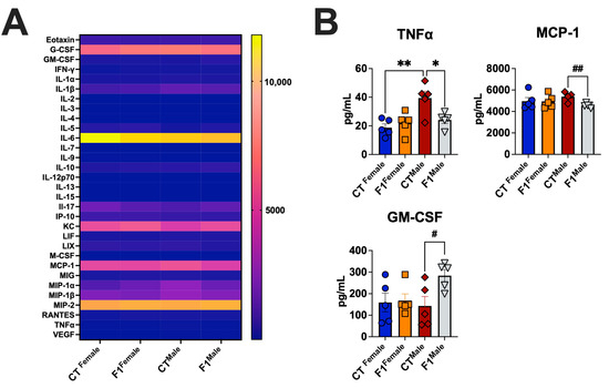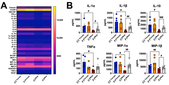 We next sought to investigate how in utero TCDD exposure affects the production and secretion of inflammatory mediators. Six hours after inoculating CT and F1 mice with Pseudomonas aeruginosa, we collected peritoneal fluid from all mice in our experiment to assess the concentration of an array of cytokines. Of the 31 cytokines that were tested, we observed insignificant differences in the majority of the cytokines that were related to monocyte and neutrophil activities. However, we did observe a significant decrease in tumor necrosis factor alpha (TNFα) and monocyte chemoattractant protein (MCP)-1 and an increase in granulocyte-macrophage colony-stimulating factor (GM-CSF) in F1 males compared to CT males (Figure 5A,B). After assessing the local cytokine production, we examined the systemic effect of the infection by assessing the concentration of numerous cytokines in the plasma of CT and F1 mice. Data revealed a significant increase in the concentration of interleukin (IL)-1α, IL-1β, IL-10, macrophage inflammatory protein (MIP)-1α, and MIP-1β in the plasma of F1 males compared to CT males 6 h after infection (Figure 6A,B). Interestingly, we also observed a decrease in cytokine production in CT males compared to CT females, further highlighting sex-specific differences in inflammatory responses.