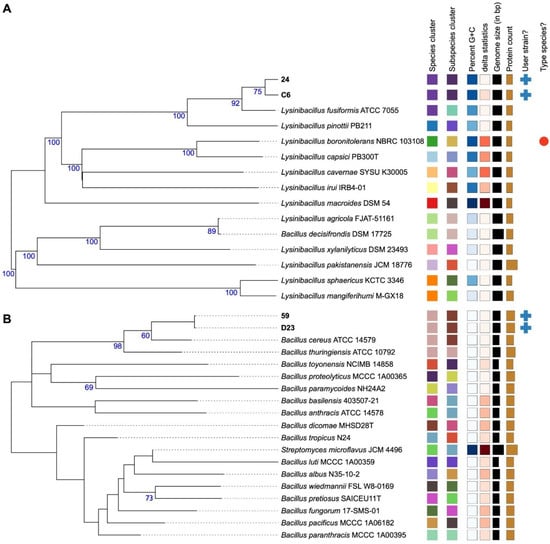 To accurately assign the taxonomy of the sequenced isolates, we used the Genome Taxonomy Database Toolkit (GTDB-Tk) v1.7.0 [47] as well as whole-genome-based phylogeny with the Type (Strain) Genome Server (TYGS) [48] from the Leibniz Institute DSMZ (German Collection of Microorganisms and Cell Cultures GmbH, Braunschweig, Germany). Moreover, TYGS (accessed on 5 August 2024) was used to find the best-matching-type strains for each genome and to subsequently calculate precise distances using the Genome Blast Distance Phylogeny approach (GBDP) under the algorithm ‘coverage’ and distance formula d5 [49]. In addition, the TYGS was used to determine pairwise digital DNA–DNA hybridization (dDDH [50]) values among isolated strains and published Bacillus and Lysinibacillus type strains. Finally, average nucleotide identity (ANI) was calculated using the orthologous ANI algorithm in BLASTN, implemented in the standalone program Orthologous Average Nucleotide Identity Tool (OAT) (https://www.ezbiocloud.net/tools/orthoani, accessed on 6 August 2024) [51].