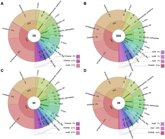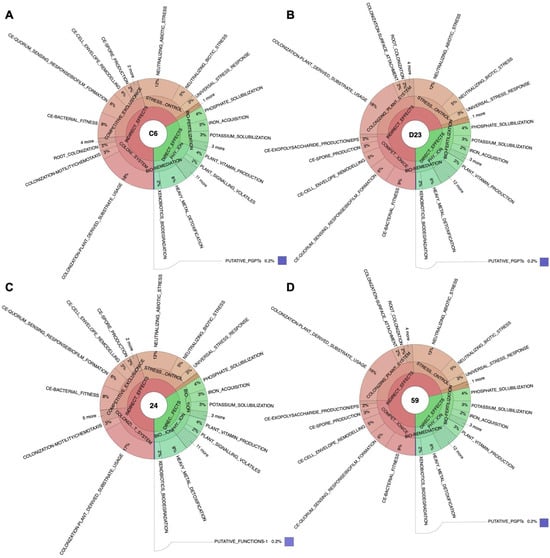 Krona plot representation of the major plant growth-promoting traits found in (A) C6, (B) D23, (C) 24, and (D) 59. Identification of plant growth promoting traits (PGPTs) was performed using BLASTP and HMMER annotation against PGPT-BASE. The depth of annotation is shown to level three of six, excluding pathways, gene names, and accession numbers.