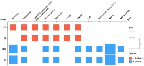 Bioinformatic analysis using AntiSMASH identified 37 biosynthetic gene clusters (BGCs) across the four genomes. L. fusiformis strains C6 and 24 contained 7 and 6 BGCs, respectively, while B. cereus strains D23 and 59 exhibited a higher number, with 12 BGCs each. BGCs are genomic regions that encode the enzymes required for the biosynthesis of specific secondary metabolites. The identified clusters included diverse types such as betalactones containing protease inhibitors (betalactones), non-ribosomal peptide synthetase (NRPS), NRPS-independent, IucA/ucC-like siderophores (NI-siderophore), NRPS-like fragment (NRPS-like), non-ribosomal peptide metallophores (NRPS-metallophores), terpene (terpene), Linear azol(in)e-containing peptides (LAP), type I PKS (Polyketide synthase, T1PKS), type III PKS (T3PKS), other unspecified ribosomally synthesized and post-translationally modified peptide products (RiPP, RiPP-like), RRE-element-containing cluster (RRE-containing), and agrD-like cyclic lactone autoinducer peptides (cyclic-lactone autoinducer) (Figure 4, Table 3).