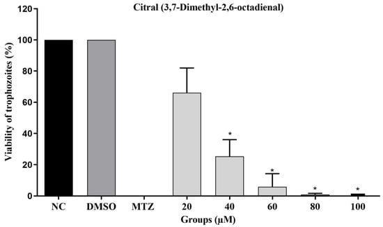 Antiparasitic activity of citral (3,7-dimethyl-2,6-octadienal) against Trichomonas vaginalis after 24 h of exposure at different concentrations. NC: negative control (T. vaginalis in TYM medium), MTZ: metronidazole (100 µM), DMSO: T. vaginalis in TYM medium with 0.6% dimethyl sulfoxide. * Statistical differences between groups compared by one-way ANOVA followed by Tukey’s post hoc tests (p < 0.001).