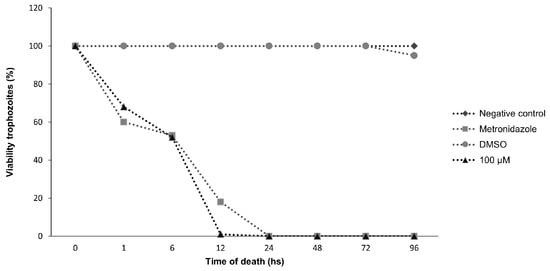 Anti-T. vaginalis activity was determined following the methodology described by Sena-Lopes et al. [14]. Briefly, assays were executed in 96-well microtiter plates with a density of 2 × 106 trophozoites/mL and incubated with the compounds at 37 °C and 5% CO2 for 24 h. Citral was evaluated at different concentrations (100 μM, 80 μM, 60 μM, 40 μM, and 20 μM), and MTZ was used as the positive control at 100 μM. Negative controls with trophozoites and a DMSO control (0.6%) were also included in every plate. Trichomonas vaginalis motility and morphology were analyzed in a Neubauer chamber by light microscopy. Later, to determine the minimum inhibitory concentration (MIC), the trophozoites present in the wells were inoculated in fresh TYM medium and incubated at 37 °C with 5% CO2 in microtiter plates, as mentioned above. A kinetic growth curve was established to obtain a more accurate profile for citral activity against T. vaginalis. Growth analysis was performed at 1, 6, 12, 24, 48, 72, and 96 h by a trypan blue dye (0.4%) exclusion assay. The tests were performed independently three times in triplicate, and the results are expressed as the percentage of viable trophozoites.
