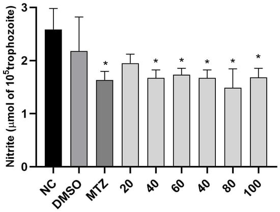 Nitric oxide levels after 24 h of exposure to different concentrations of citral. NC: negative control (T. vaginalis in TYM medium); DMSO: T. vaginalis in TYM medium with 0.6% dimethyl sulfoxide; MTZ: metronidazole (100 µM). * Statistical differences between groups compared by one-way ANOVA followed by Tukey’s post hoc tests (p < 0.05).