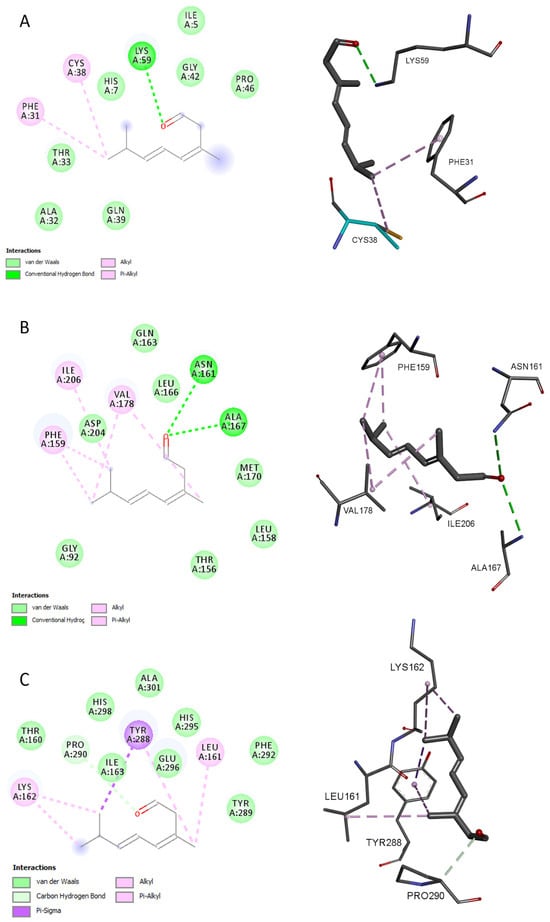 Two-dimensional interactions and three-dimensional binding mode of citral with (A) TvTrxR, (B) TvPNP, and (C) TvMGL. In red, the ketone groups and their potential interactions.