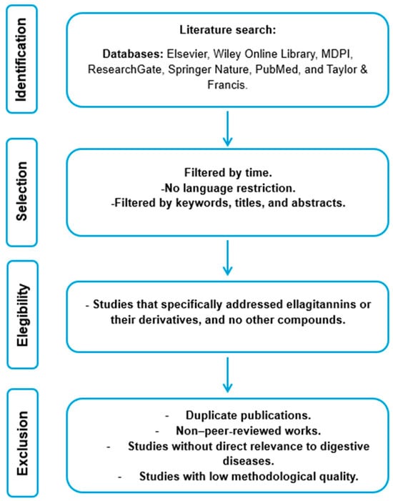 Inclusion criteria encompassed peer-reviewed publications, original research articles, review articles, book chapters, and books published in English or Spanish that explored the relationship between ellagitannins and disorders of the digestive system. Only studies specifically addressing ellagitannins or their derivatives, and no other compounds, were considered.