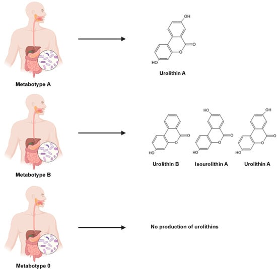 It has been demonstrated that the bacterial strains responsible for converting ellagitannins/ellagic acid into urolithins are not present in the gut microbiota of all individuals. This results in significant discrepancies among individuals in the positive effects that these compounds can have on health. Consequently, a classification of individuals capable of producing specific types of urolithins has been established [88].