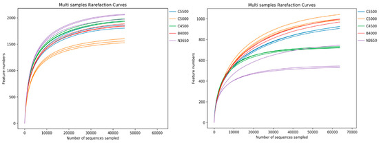 Rarefaction curves of soil bacteria and fungi at various altitude gradients. Note: Bacteria on the left, fungi on the right. The same applies below.