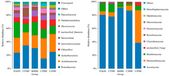 Relative abundance of soil bacterial and fungal communities at different elevation gradient gate levels.