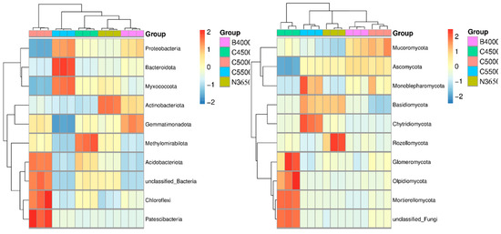 Heatmaps were generated on the basis of hierarchical clustering of bacterial and fungal phyla via relative abundance data to illustrate community composition patterns.As shown in Figure 4. The bacterial phyla were divided into two distinct clusters: the first comprised Proteobacteria, Bacteroidota, and Myxococcota, whereas the second included Acidobacteriota, Actinobacteria, Chloroflexi, Gemmatimonadota, Methylomirabilota, and Patescibacteria. In terms of the sampling sites, the bacterial community at 5000 m formed a separate cluster, whereas the communities at 3650 m, 4000 m, 4500 m, and 5500 m clustered together. Similarly, fungal phyla were also grouped into two clusters: Mucoromycota, Ascomycota, and Monoblepharomycota formed the first cluster, whereas Basidiomycota, Chytridiomycota, Rozellomycota, Glomeromycota, Olpidiomycota, and Mortierellomycota formed the second cluster. Fungal assemblages at 4500 m differed from a unified cluster at 3650 m, 4000 m, 5000 m, and 5500 m in altitude.