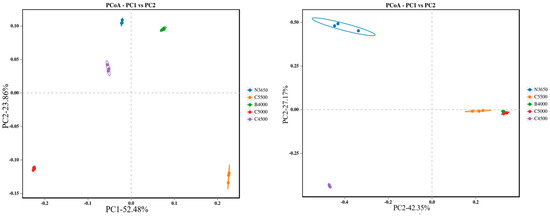 The soil microbial community structure in the Lhasa River Basin varied significantly across different elevations, reflecting distinct altitudinal responses and clear patterns of community differentiation. As shown in Figure 5. Principal coordinate analysis (PCoA) revealed that primary bacterial community variance via axes 1 and 2—PC1 (52.48%) and PC2 (23.86%)—explained 76.34% of the total variation, indicating that the model effectively captured the main structural differences in bacterial communities along the elevation gradient. The bacterial communities at different altitudes exhibited clear separation trends, whereas the samples within each elevation group presented high internal similarity. For the fungal community, PC1 (42.35%) and PC2 (27.17%) jointly accounted for 69.52% of the total variation, demonstrating that the PCoA model also successfully revealed the main differences in fungal community structure across elevations. Fungal communities at mid-elevations (4000–5000 m) strongly clustered, whereas those at 3650 m and 5500 m remained distinct from those at other elevations.