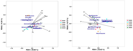 As shown in Figure 6. According to the RDA results for the bacterial community, the first two axes collectively explained 56.22% of the total variance, with RDA1 and RDA2 accounting for 39.86% and 16.36%, respectively. Soil TP, AP, pH, EC, SOM, TN, AN, and AK were positively correlated with RDA1, whereas TK was negatively correlated. Among these variables, SOM, AP, TN, AK, and AN emerged as the key drivers of bacterial community composition. For the fungal community, the first two RDA axes explained 53.35% of the total variation, with RDA1 and RDA2 contributing 33.63% and 19.72%, respectively. Soil pH, EC, TP, SOM, AN, AK, and TN were negatively correlated with RDA1, whereas TK was positively correlated. Among these variables, AP, TK, TP, pH, and EC were the primary environmental variables that significantly affected fungal community composition.