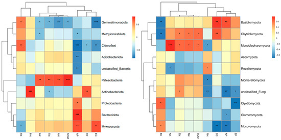 Correlation analysis of dominant bacterial and fungal populations and soil physicochemical properties in different altitude gradients. Note: Different “*” represent the significance between the microbial community and soil factors, where * indicates statistical significance at p < 0.05, ** at p < 0.01, and *** at p < 0.001.