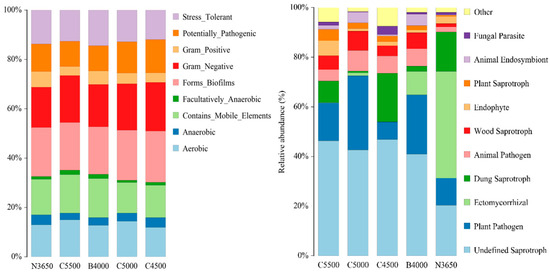 As shown in Figure 8. Phenotypic functional prediction based on the BugBase database was used to assess the potential functional dynamics of bacterial communities along the altitudinal gradient. At all elevations, the bacterial communities were dominated by biofilm-forming (Forms_Biofilms), Gram-negative (Gram_Negative), and aerobic (Aerobic) groups, which together accounted for more than 60% of the total abundance. This finding highlights the dominant ecological roles of these functional groups in the microbial networks of the Qinghai-Xizang Plateau. Additionally, functions related to mobile genetic elements (Contains_Mobile_Elements) and pathogenicity (Potentially_Pathogenic) were widely distributed across all the sites, with relatively high abundances observed at mid-to-high altitudes (4500 m and 5000 m). Fungal functional traits were annotated via the FUNGuild database. At 3650 m, the fungal community was mainly composed of ectomycorrhizal fungi, with undefined saprotrophs as the secondary group. At 4000 m, undefined saprotrophs became dominant, followed by plant pathogens. At 4500 m, the community was still dominated by undefined saprotrophs, with dung saprotrophs appearing as a secondary group. At 5000 m and 5500 m, undefined saprotrophs remained the most abundant group, with plant pathogens consistently serving as the secondary component.