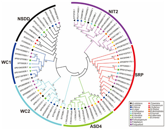 Phylogenetic analysis of GATA TFs in Aspergillus, Penicillium, Fusarium, Neurospora, Alternaria, Botrytis, and Blastomyces. Comparison of the amino acid sequences of the GATA domains revealed that these GATA TFs can be classified into six subgroups: NIT2, ASD4, SRP, NSDD, WC1, and WC2. The neighbor-joining tree was constructed based on multiple sequence alignment, and the robustness of the tree topology was assessed using 1000 bootstrap replications. Bootstrap support values above 50% are shown at the nodes.
