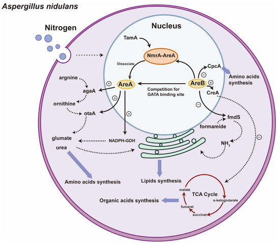 Studies on nitrogen metabolism in filamentous fungi have focused on glutamate and glutamine. Filamentous fungi assimilate ammonium to glutamate or glutamine via the NADP-dependent glutamate dehydrogenase (NADP-GDH) or glutamine synthetase–glutamine synthase (GS-GOGAT) pathways. Glutamate is involved in protein synthesis as an amino donor, whereas glutamine plays a role in the synthesis of essential metabolites such as nucleic acids, amino sugars, histidine, tyrosine, and asparagine [80,81]. For example, in A. nidulans, GATA TFs AreA and AreB work together to form a complementary regulatory network for nitrogen metabolism. AreA primarily activates the expression of nitrogen assimilation-related genes under nitrogen limitation, while AreB inhibits the expression of these genes under nitrogen abundance, thus maintaining the balance of nitrogen metabolism [35]. Small et al. found that under nitrogen-limiting conditions, the interaction of AreA with TamA led to the dissociation of AreA from the NMRA-AreA complex, activating the expression of nitrogen metabolism genes [82], which encode enzymes involved in nitrogen metabolism, such as arginase (agaA) and ornithine aminotransferase (otaA) [28]. Arginine is degraded by agaA into ornithine and urea, releasing a nitrogen source that can be utilized by the cell. Ornithine then enters the ornithine cycle and is converted to glutamate by otaA, regulating cellular nitrogen metabolism and indirectly promoting ATP synthesis [83]. This process not only optimizes nitrogen metabolism but also indirectly promotes lipid synthesis and accumulation by affecting ATP synthesis, thereby enhancing lipid production under nitrogen-limiting conditions. In contrast, under carbon-rich conditions, AreA changes from an activator to a repressor, inhibiting the expression of agaA and otaA [28], leading to a reduction in lipid synthesis. AreA participates in the process of nitrogen assimilation by directly or indirectly regulating the expression of NADP-GDH, which promotes the conversion of glutamine to glutamate [29]. Lamb et al. found that in the presence of glutamine, the NMRA binds to AreA and thus inhibits its activity. NMRA is also one of the transcription factors involved in the regulation of nitrogen source metabolism, and its transcriptional activity is partially regulated by MeaB, which can either mediate nitrogen repression together with AreA or independently [84].