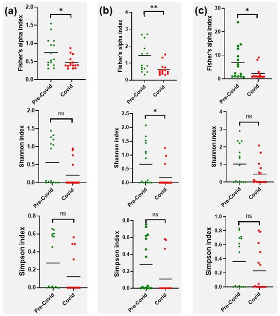 Comparison of hand microbiome alpha diversity at pre-COVID versus COVID. (a) Phyla. (b) Orders. (c) Genera. *, p<0.05; **, p<0.001; ns, not significant.