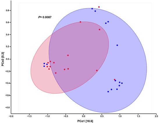 Principal coordinate analysis (PCoA) plot for comparison of hand microbiome composition in pre-COVID (blue) and COVID (red) periods.