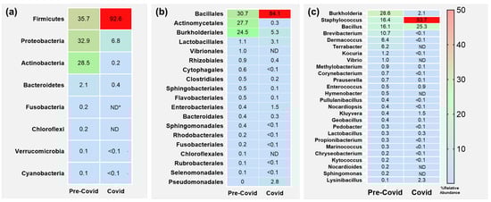 We further studied the variability at the order level (Figure 4b). The important alterations observed at the phyla level were also reflected in this case. Thus, the most prevalent orders in pre-COVID samples were Bacillales (30.7%), Actinomycetales (27.7%) and Burkholderiales (24.5%), with minorities including Lactobacillales, Vibrionales and Rhizobiales with levels around 1% or even lower. However, for the COVID samples we found again that members belonging to one single group, in this case Bacillales (84.1%), dramatically increased their levels (p < 0.001). Furthermore, none of the other orders showed levels higher than 6%. The most abundant were Burkholderiales (5.3%), Lactobacillales (3.1%), Pseudomonadales (2.8%) and Enterobacterials (1.5%), the last two increasing compared to pre-COVID levels. Remarkably, the members of the Actinomycetales, the most abundant in the pre-COVID samples after the Bacillales, virtually disappeared.