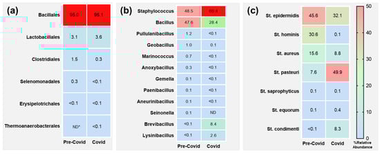 Our first approach clearly indicates that Firmicutes became predominant in the COVID period. Thus, we carried out a deeper investigation of this group. The study of the majority phylum Firmicutes revealed the absolute predominance of the Bacillales order (Figure 5a), with similar levels in both periods. Then, we analysed the genera within the Bacillales order (Figure 5b), where we detected a significant shift between the two main groups: Staphylococcus and Bacillus. The values of both groups were similar in the pre-COVID period (around 48%), but the staphylococci increased their presence in the COVID period up to 60.4%, subsequently decreasing the Bacillus to 28.4%. Furthermore, Brevibacillus also increased to 8.4% in the COVID period. Finally, we investigated the evolution of the species in the Staphylococcus genus. The four detected species in the pre-COVID period, ordered by prevalence, were S. epidermidis, S. hominis, S. aureus and S. pasteuri (Figure 5c). However, in the COVID period a significant increase in S. pasteuri (p = 0.001) was observed, while S. hominis virtually disappeared.