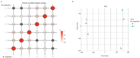 The strong inter-sample correlation between Mycobacterium smegmatis-infected macrophages in the infected group compared to the uninfected group. (A) Pearson’s coefficient analysis. (B) PCA result analysis. M. smeg-represents the uninfected macrophage group, M. smeg+ represents the infected macrophage group, and 1, 2, and 3 represent the parallel experimental groups under the same group. Each group of experiments was repeated 3 times, n = 3.