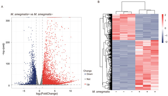 Differentially expressed genes expression enrichment analysis. (A) Results of volcano plot analysis. (B) Differential gene clustering analysis. M. smeg-represents the uninfected macrophage group, and M. smeg+ represents the infected macrophage group.