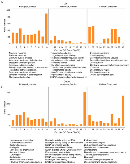 GO expression enrichment analysis. Up-regulation results (A) and down-regulation results (B). M. smeg-represents the uninfected macrophage group, and M. smeg+ represents the infected macrophage group.