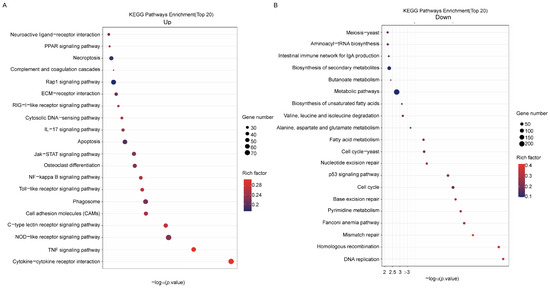 KEGG expression enrichment analysis. Up-regulation results (A), down-regulation results (B). M. smeg-represents uninfected macrophage group, M. smeg+ represents infected macrophage group.