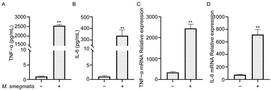 The above sequencing results show that M. smeg can regulate the immune response of macrophages, and multiple immune-related molecular signaling pathways and transcription factor IRF are regulated and activated. Therefore, we intend to verify the sequencing results at the molecular biological level. From the above GO analysis and KEGG analysis results, as well as the transcription factor sequencing results, it is demonstrated that M. smeg can regulate the immune response of macrophages and the activation of related immune signaling molecular pathways. The immune signaling molecular pathway and the transcription factor IRF can promote the expression of various cytokines. Studies have shown that cytokines IL-6 and TNF-α can activate macrophage immune responses regulated by MTB, and they are closely related to the activation of cellular immune signaling pathways [21]. Therefore, in this study, we detected the changes in the expression levels of IL-6 and TNF-α in macrophages after infection with M. smeg by qPCR and ELISA. The results showed that macrophages infected with M. smeg could regulate the production of cytokines IL-6 and TNF-α (Figure 5). The above results indicate that M. smeg can regulate the activation of macrophage immune responses and are consistent with the results of transcriptome sequencing.