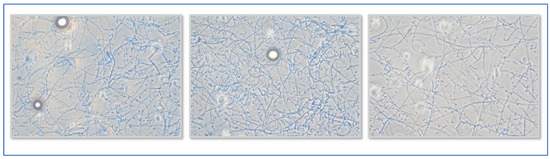 The culture examination was set up by inoculating a Sabouraud glucose agar with gentamicin and chloramphenicol (Oxoid Ltd., Wesel, Germany) and a Dermasel selective medium (Oxoid Ltd., Wesel, Germany), both then incubated at 30 °C for 21 days, with readings every 48 h.
