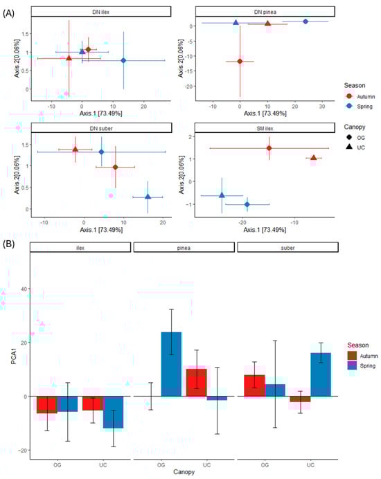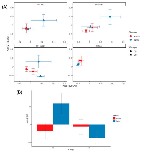 Regarding the prokaryotic composition in dehesas (Figure 1A), samples were grouped by site (p-value = 0.061) and season (p-value = 0.078) on the first axis. A pattern in which samples are separated by site (p-value < 0.05) and canopy (p-value = 0.087) emerged, clustering Q. ilex opposite to P. pinea and Q. suber and OG opposed to the under-canopy area (Figure 1A).