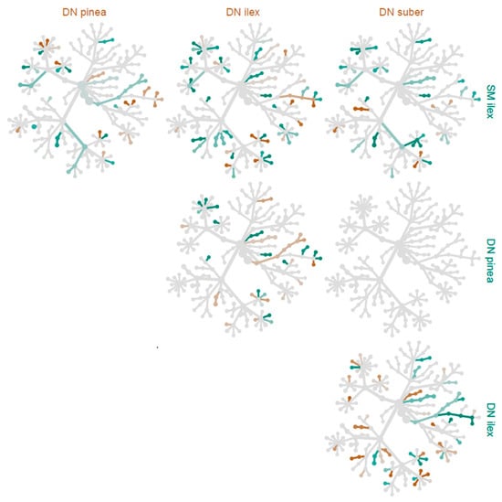 Differences in taxonomical groupings between sites and tree species. Each color corresponds to one of the sites and tree species compared to another one (blue vs. brown). The thickness of the branch and nodes represents the OTU count, while the color represents the log 2 median ratio of the counts. This is a value used to represent differential genetic expression, but in this work, it is used to represent the differential representations of the taxa in our samples. Nodes and branches in grey mean that no statistical differences were found between groupings for that taxon. Colored nodes represent statistically significant changes between taxa. Branches or nodes colored in blue correspond to the environment indicated in the rows, while those colored in brown correspond to taxa that are in higher proportions in the environment indicated in the columns. For a legend of this figure, see Figure S3.