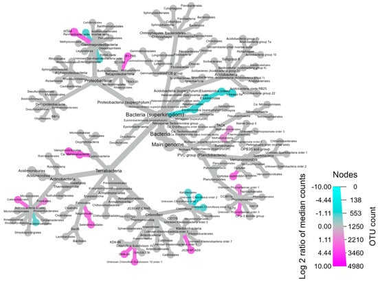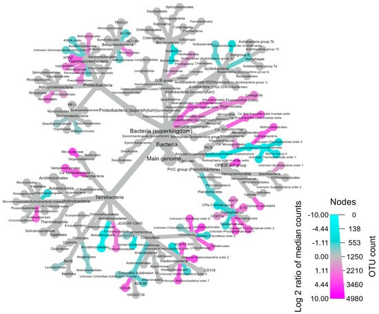 In order to assess the influence of the different treatments on the taxonomical groupings, the DESeq2 differential abundance test [26] was used to assess the statistical significance of differences between samples, and the logarithm of the fold change was used to measure the size of the difference. The taxonomic trees (heat trees) of these differences were developed using the “Metacoder” package [27].