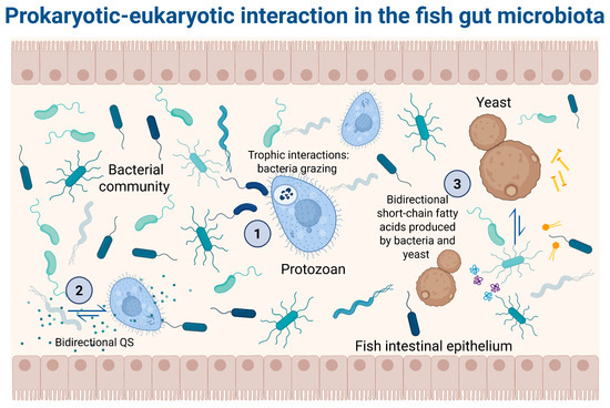Prokaryotic–eukaryotic interaction in the fish gut microbiota. (1) Trophic interaction: bacteria predation by protozoan, leading to nutrient regeneration, such as phosphorus and nitrogen. Moreover, protozoans may regulate bacterial community structure by grazing behavior, consuming more than 1000 bacterial cells per hour [41]. (2) Bidirectional quorum sensing (QS): Chemical signals produced by bacteria are used by protozoans to communicate among themselves. For example, bacteria can synthesize N-acyl-L-homoserine lactones (AHLs) that bind with the AHL receptors in some protozoans. Similarly, QS communication through the MHF [4-hydroxy-5-methylfuran-3 (2H)-one] production by fungi cells has been reported [42]. (3) Interaction through metabolite production: Bacteria release a diversity of metabolites that can be used by certain protozoans, such as short-chain fatty acids, like butyrate, produced by bacteria (Faecalibacterium and Roseburia). Yeasts like Saccharomyces boulardii can produce an antitoxic effect against toxins secreted by bacteria. Additionally, yeasts can produce an antimicrobial effect by the production of short-chain fatty acids and polyamines. Finally, protozoans like Tritrichomonas musculis influence the host’s metabolism to release free choline, which can be utilized by choline-utilizing bacteria, thereby promoting a healthier bacterial community [43,44].