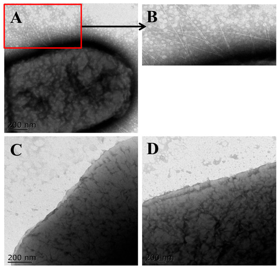 The following experiment was performed as described previously [16]. Bacterial cultures were grown statically in LB broth at 37 °C for 24 h. Cells were washed twice with PBS buffer. A small aliquot of bacterial suspension was applied to copper grids and allowed to adhere for 10 min. Excess liquid was gently removed with filter paper. Samples were negatively stained with 1% phosphotungstic acid (pH 7.4) for 5 min, then immediately blotted dry with filter paper. Finally, grids were dried under a lamp at 65 °C prior to observation using an FEI Tecnai T12 TEM (FEI, Hillsboro, OR, USA). CE129 was used as the positive control, and SE5000 (pBR322) was used as the negative control.