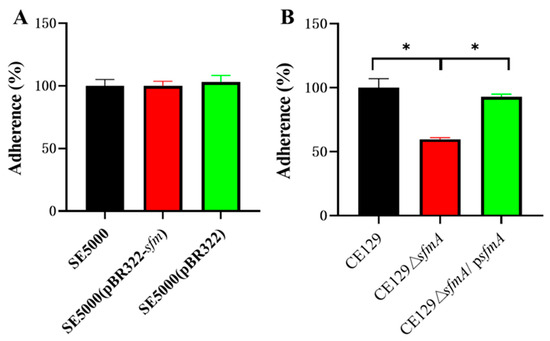 For SE5000, SE5000 (pBR322-sfm), and SE5000 (pBR322), there was no significant difference in adherence ability toward DF-1 cells (p > 0.05) (Figure 2A).