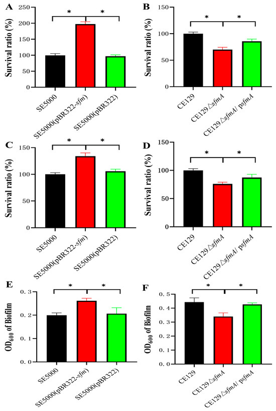 Effect of Sfm on survival ability. (A) Survival ratio of SE5000, SE5000 (pBR322), and SE5000 (pBR322-sfm) in HD11 engulfment experiments. Y-axes indicate the ratio of average survival CFU compared with SE5000. (B) Survival ratio of CE129, CE129ΔsfmA, and CE129ΔsfmA/psfmA in HD11 engulfment experiments. Y-axes indicate the ratio of average survival CFU compared with CE129. (C) Survival ratio of SE5000, SE5000 (pBR322), and SE5000 (pBR322-sfm) in SPF chicken serum sterilization experiments. Y-axes indicate the ratio of average survival CFU compared with SE5000. (D) Survival ratio of CE129, CE129ΔsfmA, and CE129ΔsfmA/psfmA in SPF chicken serum sterilization experiments. Y-axes indicate the ratio of average survival CFU compared with CE129. (E,F) Qualitative analyses of biofilm formation. Results of the crystal violet method were observed at OD600. * indicates significantly different values (p < 0.05).
