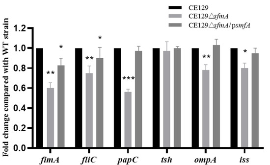 The changes in the transcription levels of key virulence genes (fimA, fliC, papC, tsh, ompA, and iss) in CE129 under the influence of Sfm were analyzed using fluorescence RT-qPCR. The deletion of Sfm led to transcription reductions of 40% (fimA), 23% (fliC), 43% (papC), 21% (ompA), and 18% (iss), while the transcription level of tsh was unaffected (p > 0.05). The transcription levels of these genes were partially or fully restored in CE129ΔsfmA/psfmA (Figure 4).