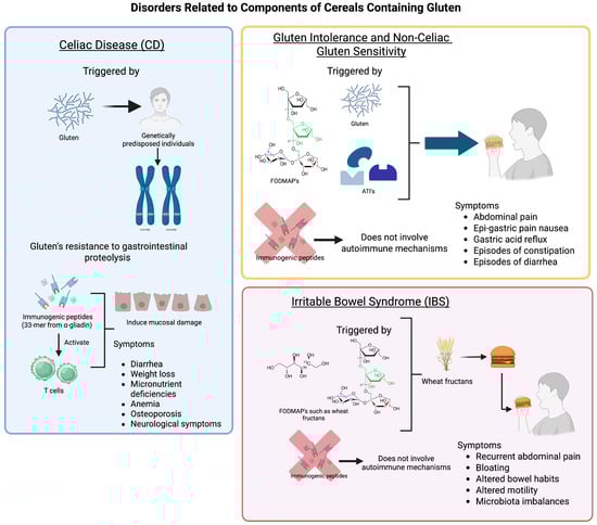Irritable bowel syndrome (IBS) (Figure 1) affects about 10% of the global population and is characterized by recurrent abdominal pain, bloating, and altered bowel habits [38,39]. Though not immunologically mediated, IBS often shares symptomatology with gluten-related disorders such as CD and NCGS [40]. Its pathogenesis involves dysregulation of the gut–brain axis, altered motility, and microbiota imbalances.