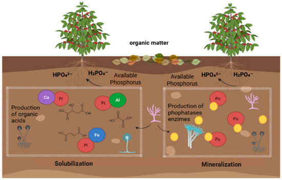 PSF naturally recycle P from the soil through mineralization and solubilization, making it available to plants (Figure 1). Through the mineralization process, PSF produce phosphatase enzymes that dephosphorylate organic compounds present in the soil by breaking phosphoester or phosphoanhydride bonds. Among the diversity of phosphatases produced by PSF, acid and alkaline phosphatase enzymes are the most abundant in nature [6], with acid phosphatases being predominant in acidic soils such as the coffee-growing soils of Veracruz [7,8].