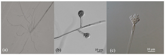 Morphology of Absidia sp. YP22: (a) rhizomorph (10), (b) sporangia (40), and (c) apophysis with sporangiospores (100).