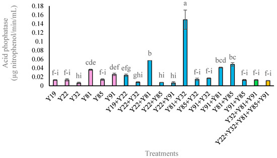 The analysis of variance revealed significant differences in acid phosphatase activity between the liquid cultures of the treatments evaluated (p = 0.001). The Y32+Y81 consortium obtained the highest acid phosphatase content (0.149 µg nitrophenol/min/mL) compared to the other treatments evaluated (p < 0.01) (Figure 6).