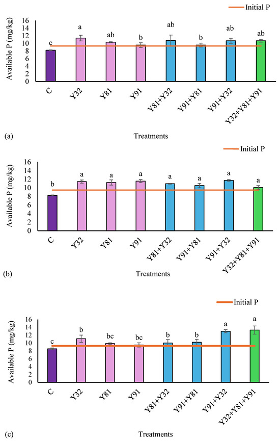 In the rhizosphere of the plants, the available P content differed according to variety. For Anacafe and Costa Rica, the P availability was higher for all treatments than for the control (p < 0.05) (Figure 7a,b). In the Marsellesa variety, the treatments Y91+Y32 and Y32+Y81+Y91 had the highest available P content (p < 0.05) (Figure 7c).