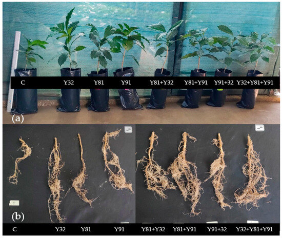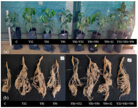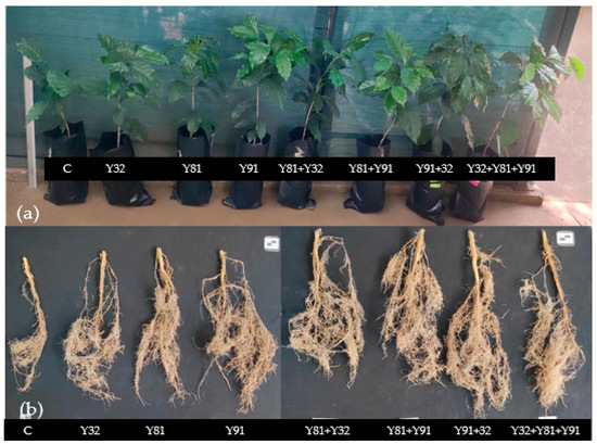 (a) Plants and (b) roots of the Anacafe variety inoculated with the different treatments at 180 days.