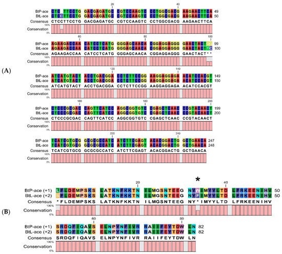 (A) Sequence alignment of a fragment of the ace1 gene from two populations of B. tabaci collected from pepper (BtP-ace) and lantana (BtL-ace). (B) The protein-alignment sequences of a region of the ace1 gene of the two populations of B. tabaci collected from pepper (BtP-ace) and lantana (BtL-ace). *: amino acid change/nucleotide substitution.