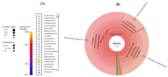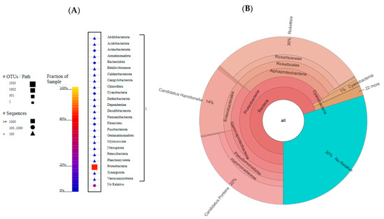 (A) shows the taxonomy fingerprint at the phylum level obtained in the SILVAngs database. (B) Krona plots showing 16S-based taxonomic analysis results for sequencing run of MEAM1-B biotype.