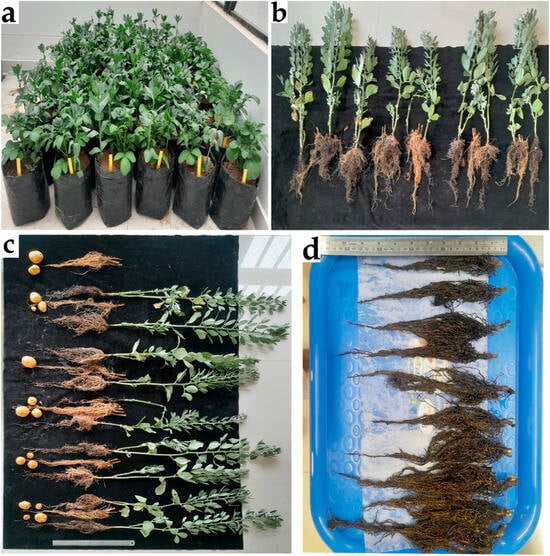 Processes carried out in the greenhouse and in the laboratory. In (a), the development of potato and bean plants in the greenhouse is shown; (b) shows the evaluation of the height of the bean plant; (c) shows the obtainment of the number of tubers and length of the potato root and beans; and (d) shows the cleaning and preparation of the bean root for drying in the oven.