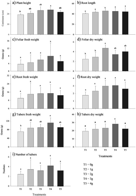 Effect of the biostimulant MycoUp mycorrhization on S. tuberosum plant characteristics: plant height (a), root length (b), foliar fresh weight (c), foliar dry weight (d), root fresh weight (e), root dry weight (f), tuber fresh weight (g), and dry weight (h) of potato, and number of tubers for treatment (i). Values with the same letter represent means that did not differ significantly (95%), according to Tukey’s HSD test. Error bars represent the standard deviation.The growth of V. faba plants treated with the biostimulant MycoUp exhibited significant increases in several parameters, including root length (cm), fresh leaf weight (g), fresh root weight (g), and dry root weight (g), as illustrated in Figure 3. In particular, significant increases (p-value < 0.05) were found in root length (Figure 3b) with a concentration of 3 g (120%) and 4 g (124%), and similarly in foliar fresh weight (Figure 3c), (115%), root fresh weight (Figure 3e) (159%), and root dry weight (Figure 3f) inoculated with 4 g (243%).