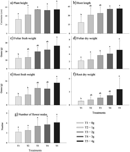 Effect of biostimulant on V. faba plant characteristics: plant height (a), root length (b), foliar fresh weight (c), foliar dry weight (d), root fresh weight (e), root dry weight (f), and number of flower nodes (g). Values with the same letter represent means that did not differ significantly (p-value < 0.05) according to Tukey’s HSD test. Error bars represent the standard deviation.